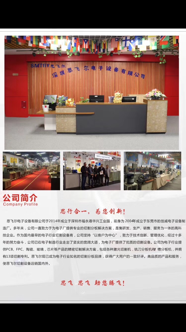 深圳思飛爾電子設(shè)備有限公司是一家專業(yè)致力于自動化設(shè)備開發(fā)、生產(chǎn)、銷售于一體的公司,具有多年開發(fā)、生產(chǎn)經(jīng)驗(yàn)和雄厚的技術(shù)力量及生產(chǎn)能力。擁有長期致力于自動化控制及編程的技術(shù)人員和銷售團(tuán)隊(duì),開發(fā)有各種自主品牌自動化設(shè)備項(xiàng)目。自主品牌設(shè)備有激光切割機(jī),FPC激光分板機(jī),PCB激光切割機(jī),陶瓷激光切割機(jī),等設(shè)備。功能齊全,性價(jià)比高,幫助電子廠又好又快制造產(chǎn)品歡迎垂詢、洽談。